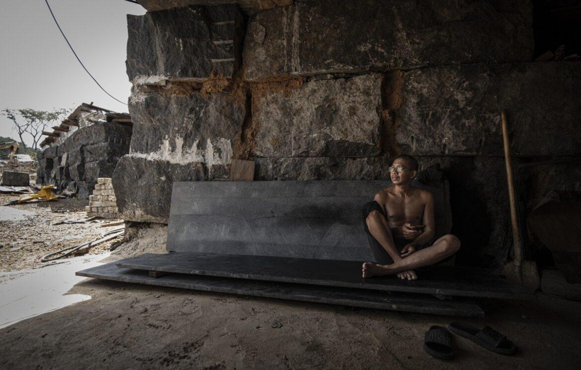 Sierra Leone: un lavoratore cinese dell’impresa Hongtai si concede una pausa dal lavoro di estrazione del granito nelle vicinanze del Western Area National Park. – Foto di Simon Townsley / Panos Pictures