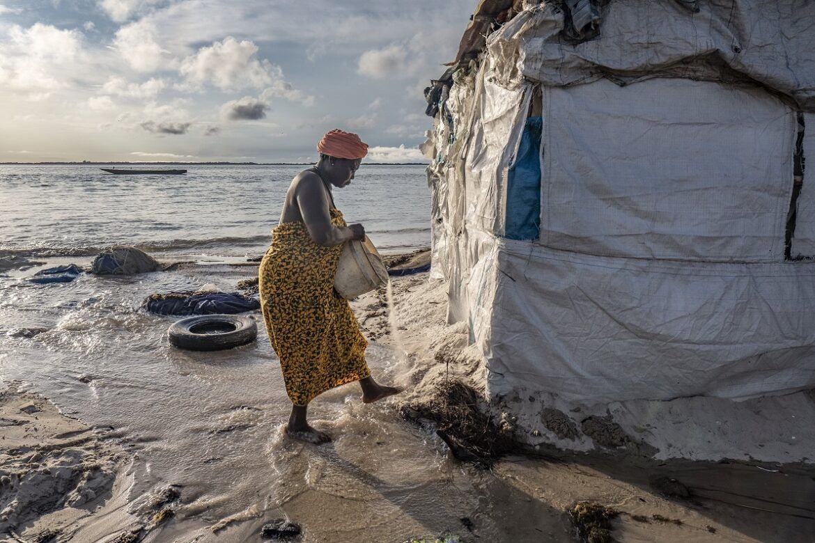 Sierra Leone: una residente dell’isola di Nyangai tenta di proteggere la sua casa dall’alta marea con rinforzi di sabbia. – Foto di Tommy Trenchard / Panos Pictures