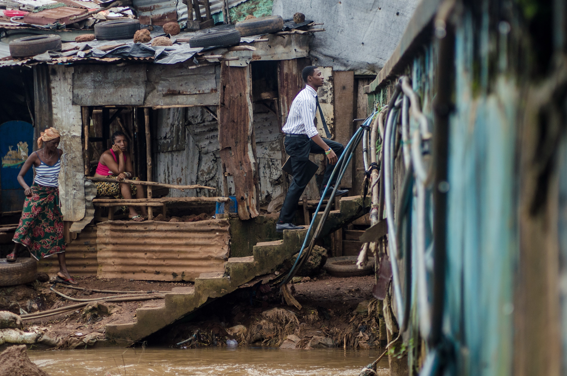 Uno scorcio dello slum di Kroo Bay. Dopo oltre 10 anni di guerra civile (1991-2002), Freetown ha visto raddoppiare la sua popolazione – oggi circa 1,3 milioni di abitanti – senza una minima pianificazione per lo sviluppo delle infrastrutture, degli alloggi e dei servizi di base. – Foto di Mustafah Abdulaziz