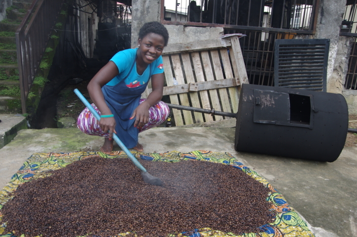 Freetown: nel giardino del suo laboratorio Hannah è impegnata nella fase di tostatura, o torrefazione, dei chicchi di caffè. Questo processo viene eseguito a mano sul fuoco per 15-20 minuti.