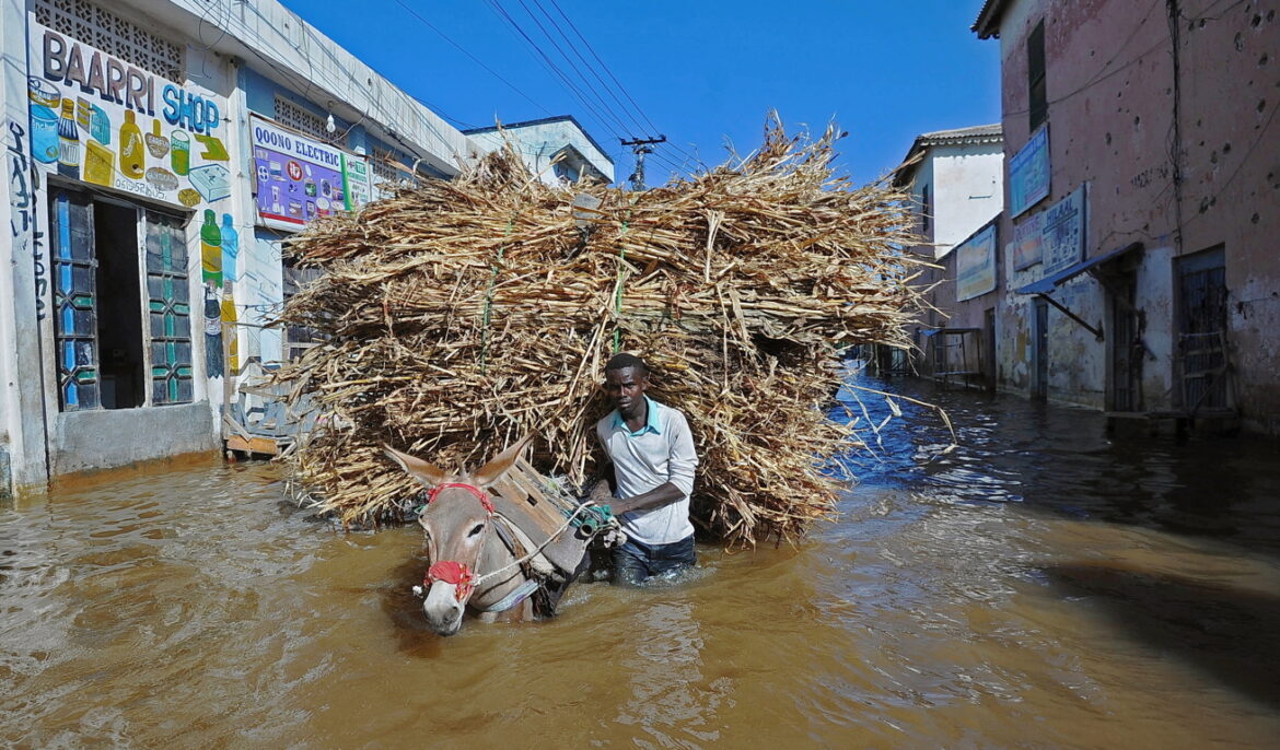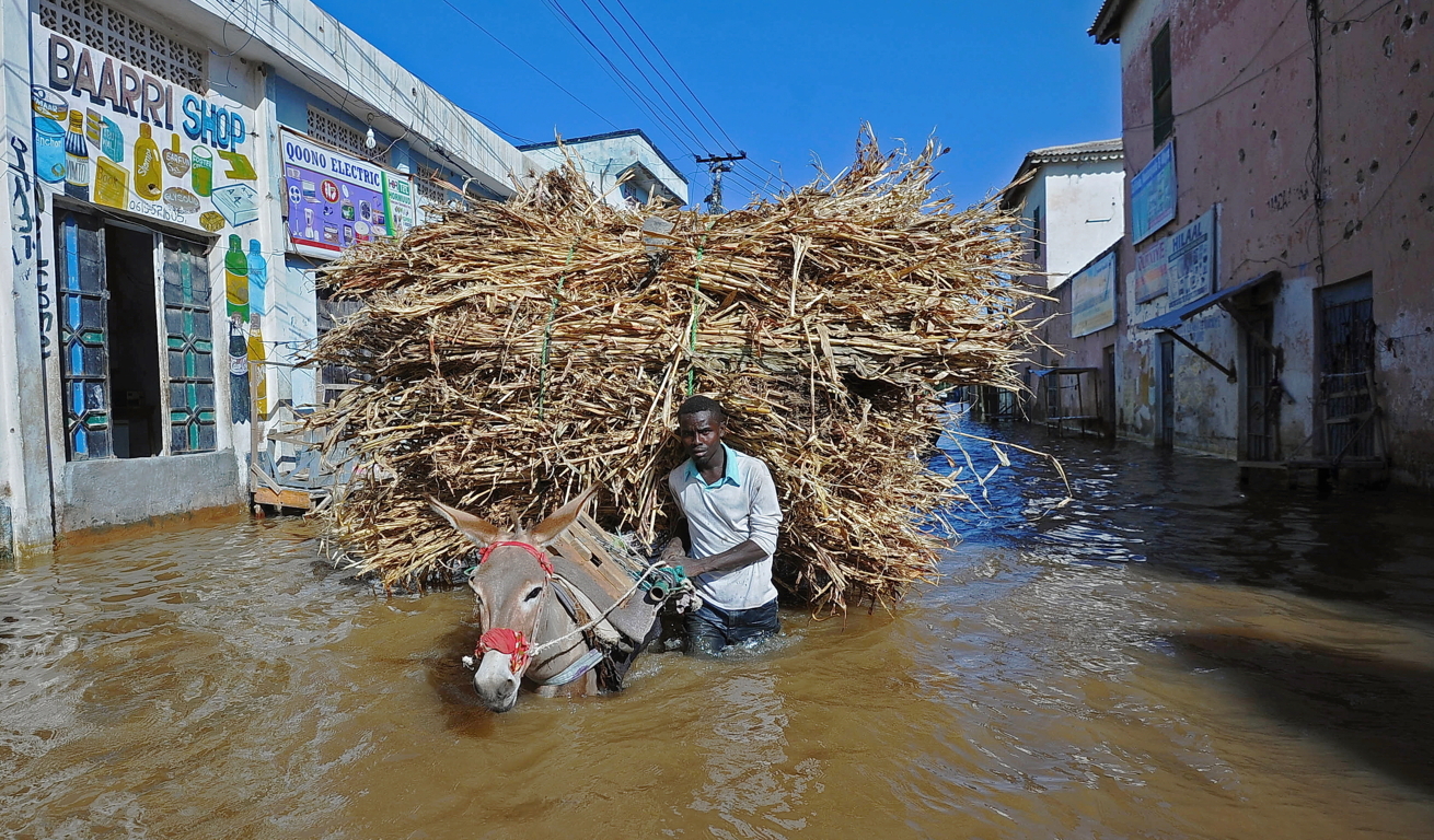 Nella foto di M. Abdiwahab: un uomo tira il suo asino in una strada inondata a nord di Mogadiscio.
