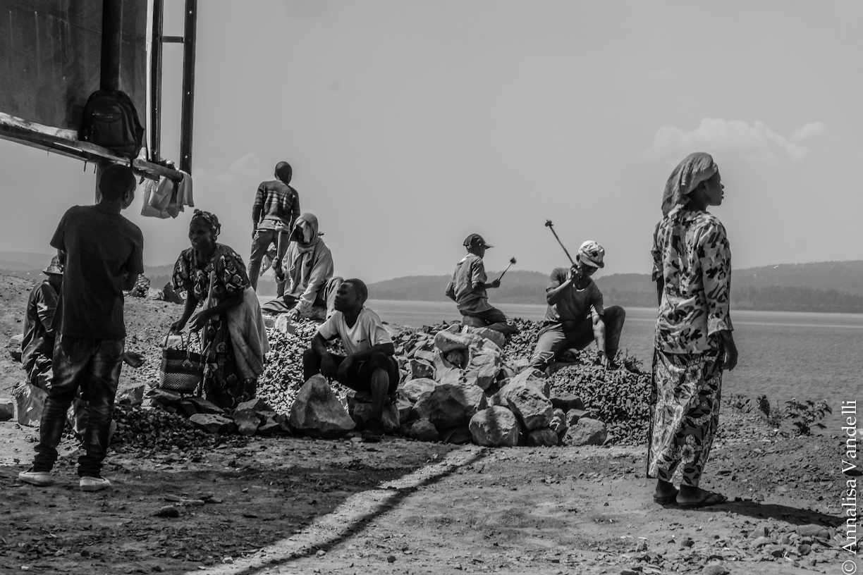 I giovani fuori dal finestrino del Minivan, intanto, spaccano le pietre per farne ghiaia: dalla mattina alla sera sotto il sole seduti su un cumulo di sassi da prendere a martellate. Riziki mantiene così sei figli ma i soldi non bastano mai, si paga tutto, anche la scuola è a pagamento. Il governo paga poco o non paga da anni i maestri, la gente si autotassa ma non tutti i bambini possono andarci. Così, tre dei figli di Riziki si dedicano alla raccolta della plastica in strada e la rivendono per un sedicesimo di dollaro al chilo.