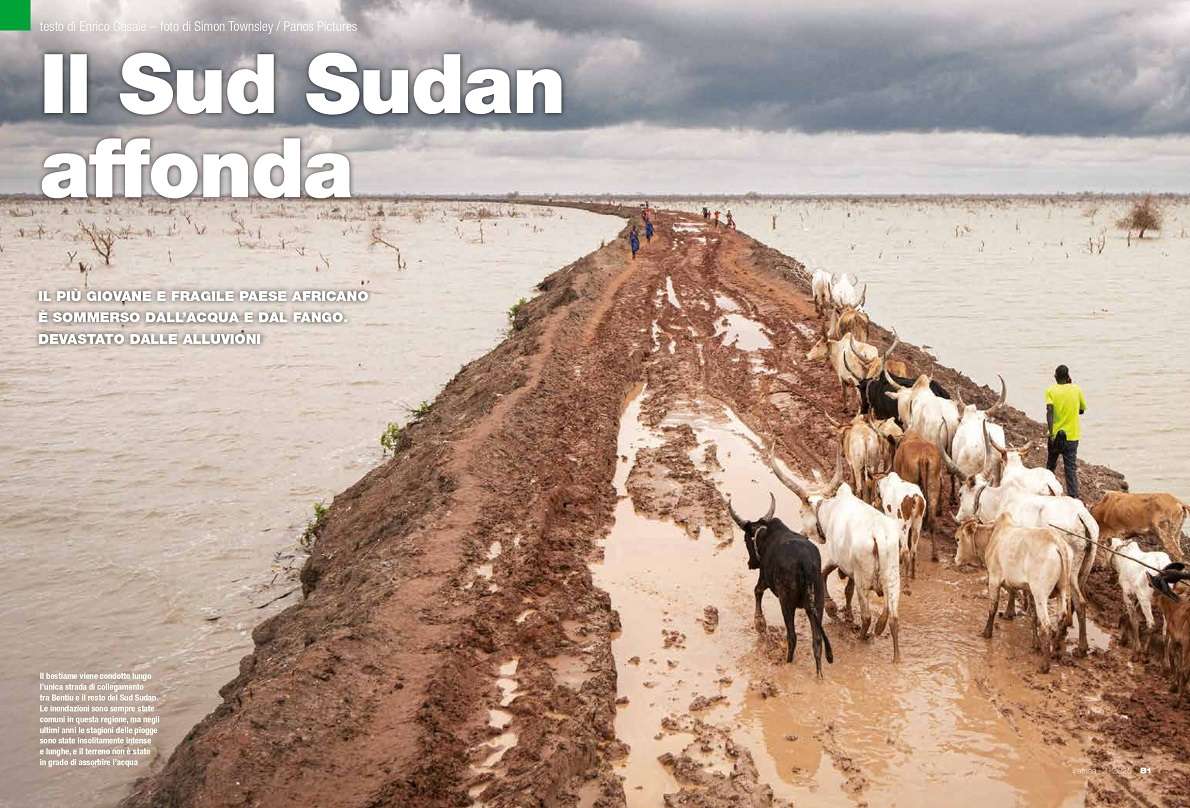 Il bestiame viene condotto lungo l’unica strada di collegamento tra Bentiu e il resto del Sud Sudan. Le inondazioni sono sempre state comuni in questa regione, ma negli ultimi anni le stagioni delle piogge sono state insolitamente intense e lunghe, e il terreno non è stato in grado di assorbire l’acqua. – Copertina del servizio “Il Sud Sudan affonda” pubblicato sul numero di marzo-aprile della rivista Africa.