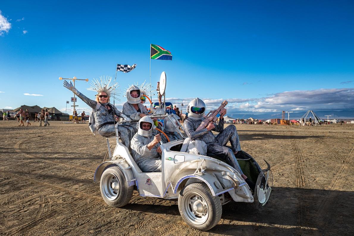 I partecipanti del festival AfrikaBurn si muovono coi mezzi più bizzarri, in una sfrenata gara di fantasia. – Foto di Reza Assar
