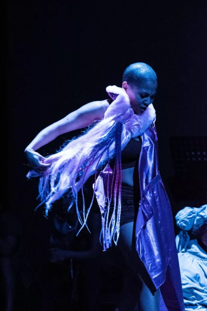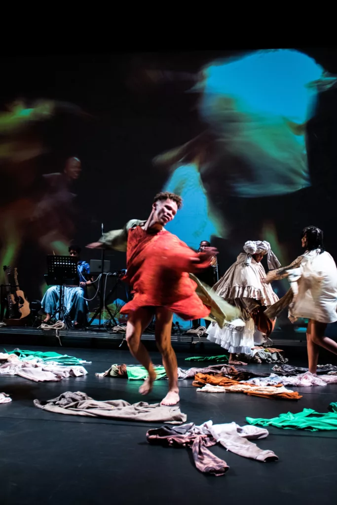 “Come è possibile fiorire in un deserto di sale?” È una rappresentazione di danza teatro che fa riflettere sulle idee di potere, di gerarchia sociale e di privilegio. Parte integrante dello spettacolo è il duo di musicisti UkhoiKhoi, che fa entrare lo spettatore in un universo musicale multisensoriale. La band di musica elettronica indigena, caratterizzata dal live looping, è formata dal musicista e compositore Yogin Sullaphen e la cantante e artista Anelisa Stuurman. Il duo è molto speciale agli occhi di Robyn Orlin, ed è infatti la seconda collaborazione dopo il precedente spettacolo “We wear our wheels with pride and slap your streets with colour… we said ‘bonjour’ to Satan in 1820”. Yogin proviene da un background di eredità mista, con un padre indiano sudafricano e una madre coloured. Annalizer, il nome d’artista di Anelisa, sebbene con un cognome Afrikaans, ha origini zulu e parsi. Il duo ha sede a Johannesburg, in Sudafrica, e ha unito le forze a metà 2019. Il loro nome è un’ode alla loro comune eredità KhoiSan.
