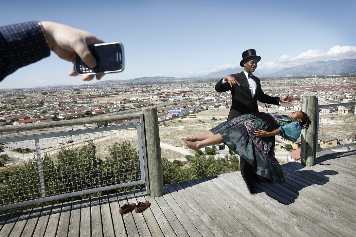 Due diplomati al College of Magic mettono in scena un numero di lievitazione. Sullo sfondo una township di Città del Capo. – Foto di Marco Garofalo.