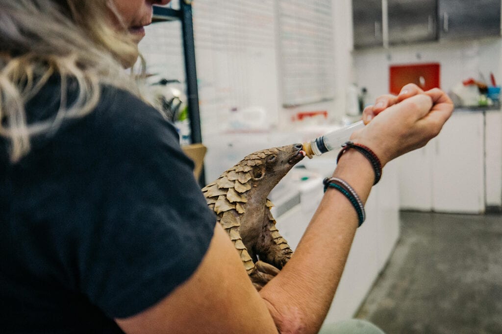 Nicci da vent’anni si occupa di curare la fauna selvatica dell’Africa. Il suo centro, finanziato da donazioni private, raccoglie i pangolini che la polizia sudafricana recupera dopo aver arrestato i bracconieri. Quasi ogni settimana arriva un nuovo esemplare, che viene assistito e accudito in tutto per tutto. Un giovane volontario ha appena parcheggiato fuori dell’ambulatorio e scende dall’auto con un pangolino raggomitolato tra le braccia. «Il pomeriggio gli animali vengono accompagnati in un campo ricco di formiche e termiti, che rappresentano la base della loro dieta – spiega Nicci Wright –. I pangolini non sono in grado di nutrirsi in cattività. Se dai loro una ciotola piena di formiche, non la mangiano! Gli esemplari che le autorità ci inviano soffrono degli stessi disturbi osservati nelle persone con stress post-traumatico».