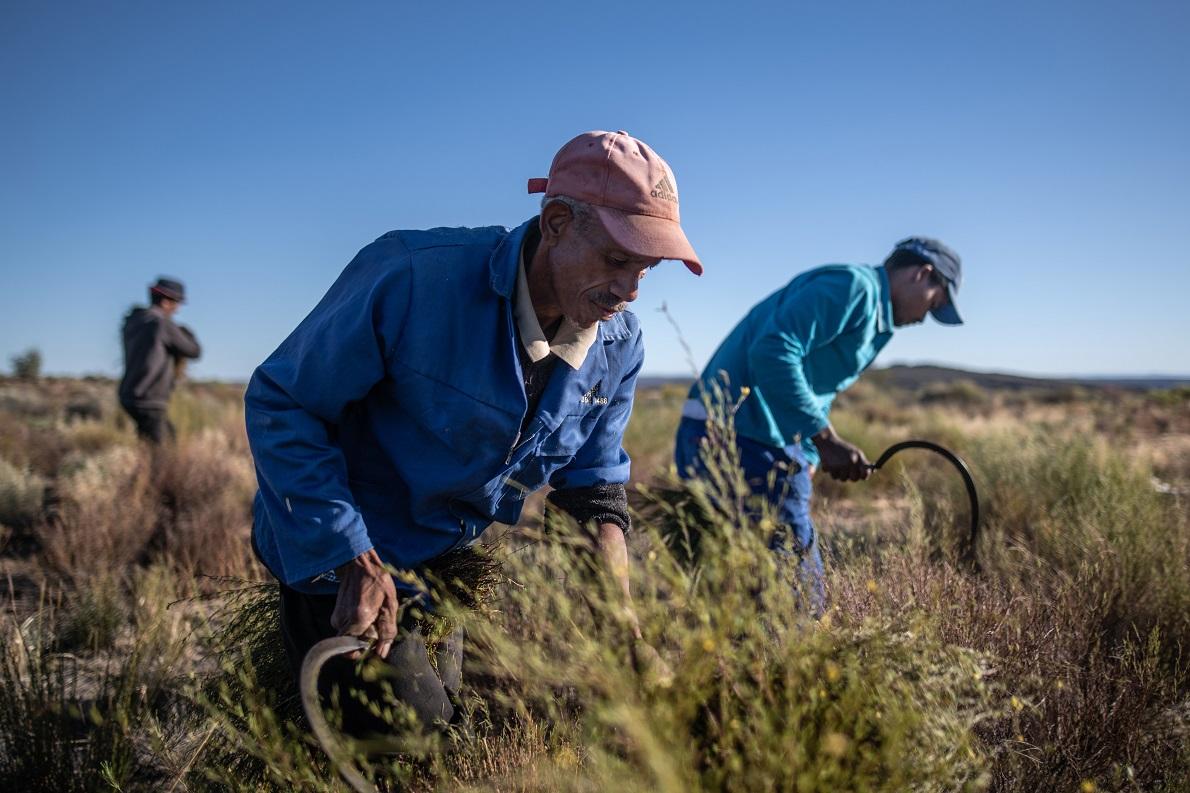 Lavoratori della cooperativa Wupperthal Original Rooibos impegnati nella raccolta e nella lavorazione delle preziose foglie di rooibos. – Foto di Tommy Trenchard / Panos
