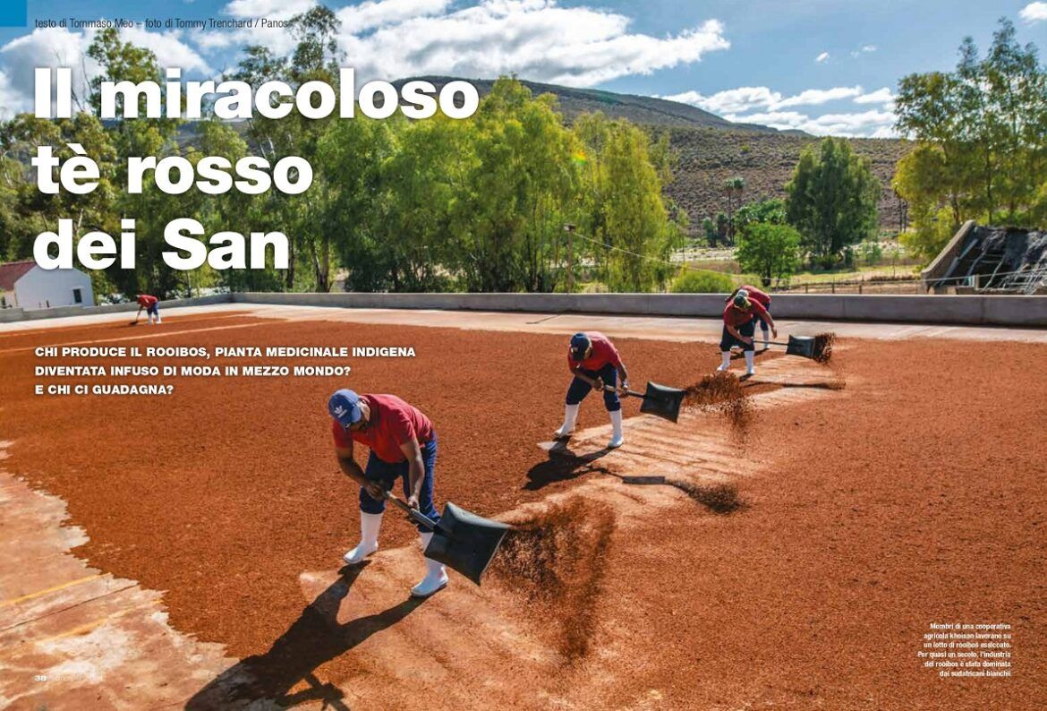 Sudafrica: membri di una cooperativa agricola khoisan lavorano su un lotto di rooibos essiccato. Per quasi un secolo, l’industria del rooibos è stata dominata dai sudafricani bianchi. – Copertina del servizio “Il miracoloso tè rosso dei San” pubblicato sull’ultimo numero della rivista Africa. – Foto di Tommy Trenchard / Panos