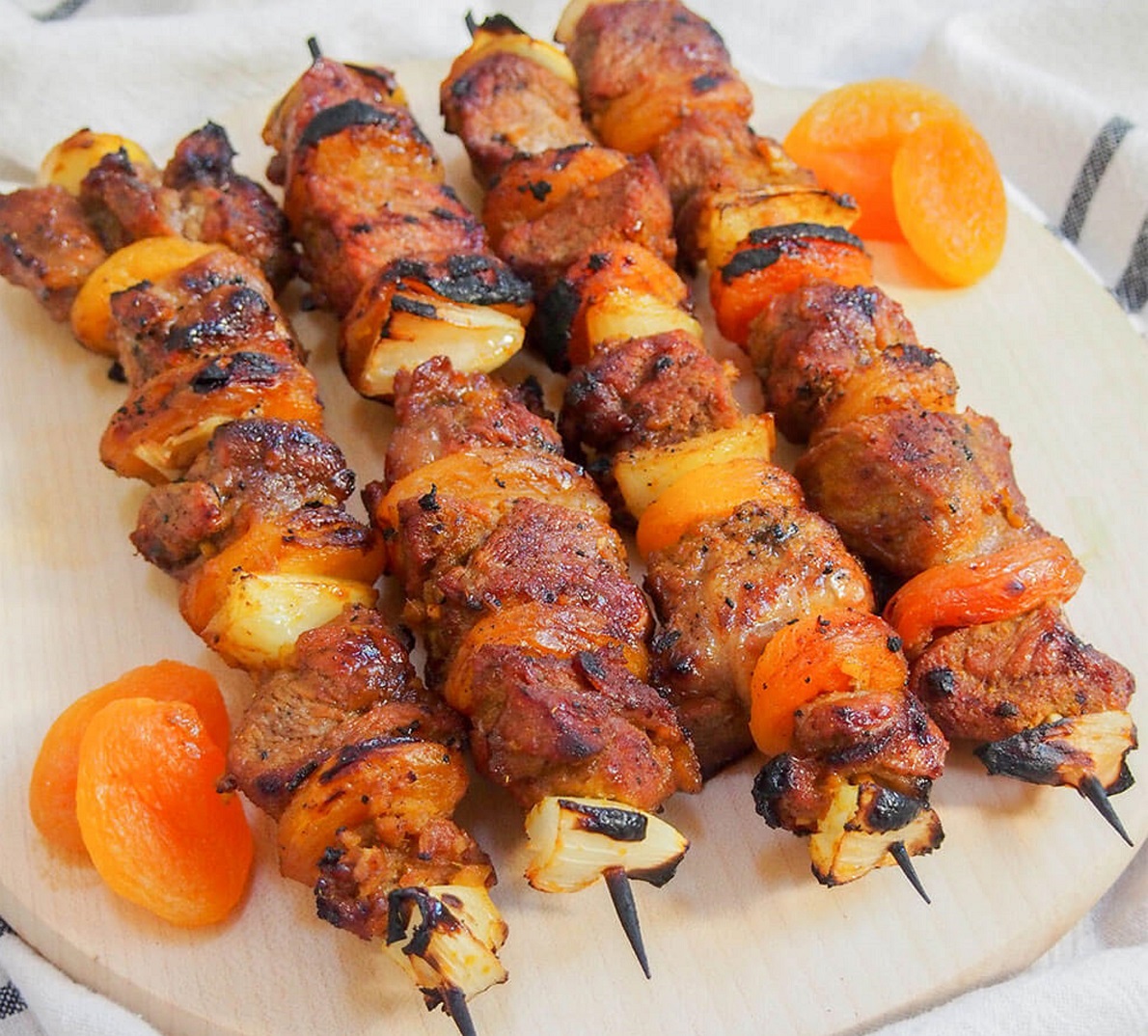 • 450 gr di cosciotto di agnello a cubetti • 150 gr di albicocche secche • 2 cipolle rosse • 30 ml di aceto di vino • 3 cucchiai di marmellata di albicocche • 1 spicchio d’aglio grattugiato •1 cucchiaino di zenzero fresco grattugiato •1 cucchiaio di curry in polvere • 1 cucchiaino di cumino • sale q.b. • spiedini di bambù per cucinare
