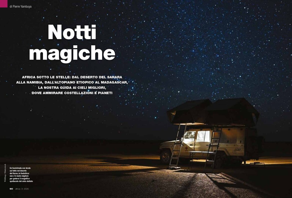 Un fuoristrada con tenda sul tetto nel deserto del Karoo, in Sudafrica: non c’è modo migliore per godersi il magnifico spettacolo del cielo stellato. – Copertina del servizio “Notti magiche” pubblicato sull’ultimo numero della rivista Africa. Foto di Wildsnap/Shutterstock