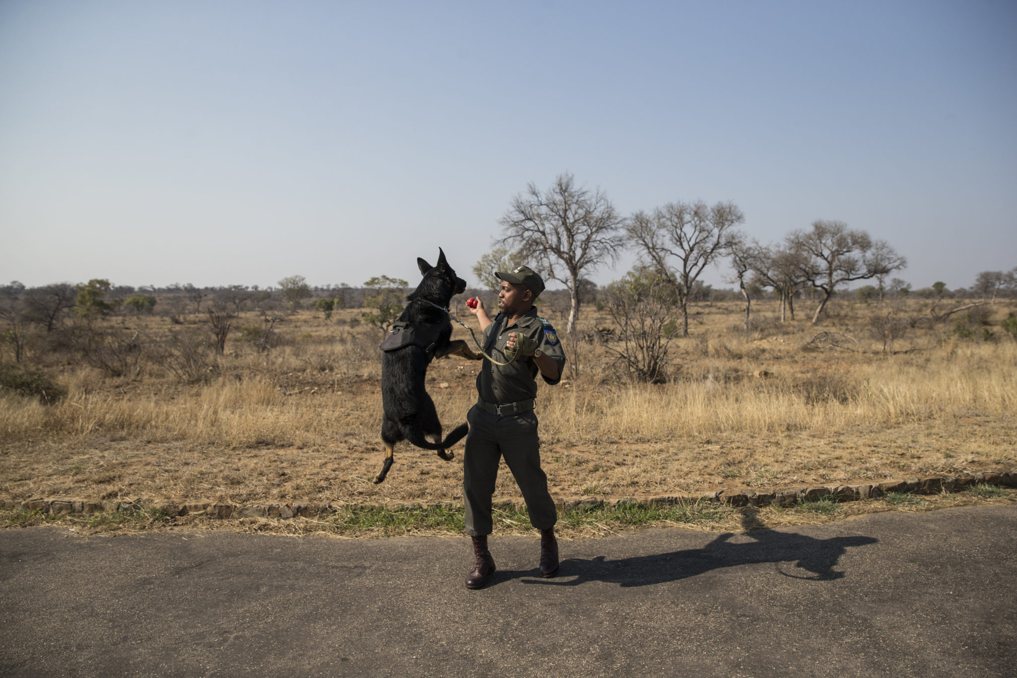 Ranger sudafricano dell’unità K9 del National Parks Service gioca con il suo cane a un posto di blocco al Kruger National Park. – Foto di Florent Vergns