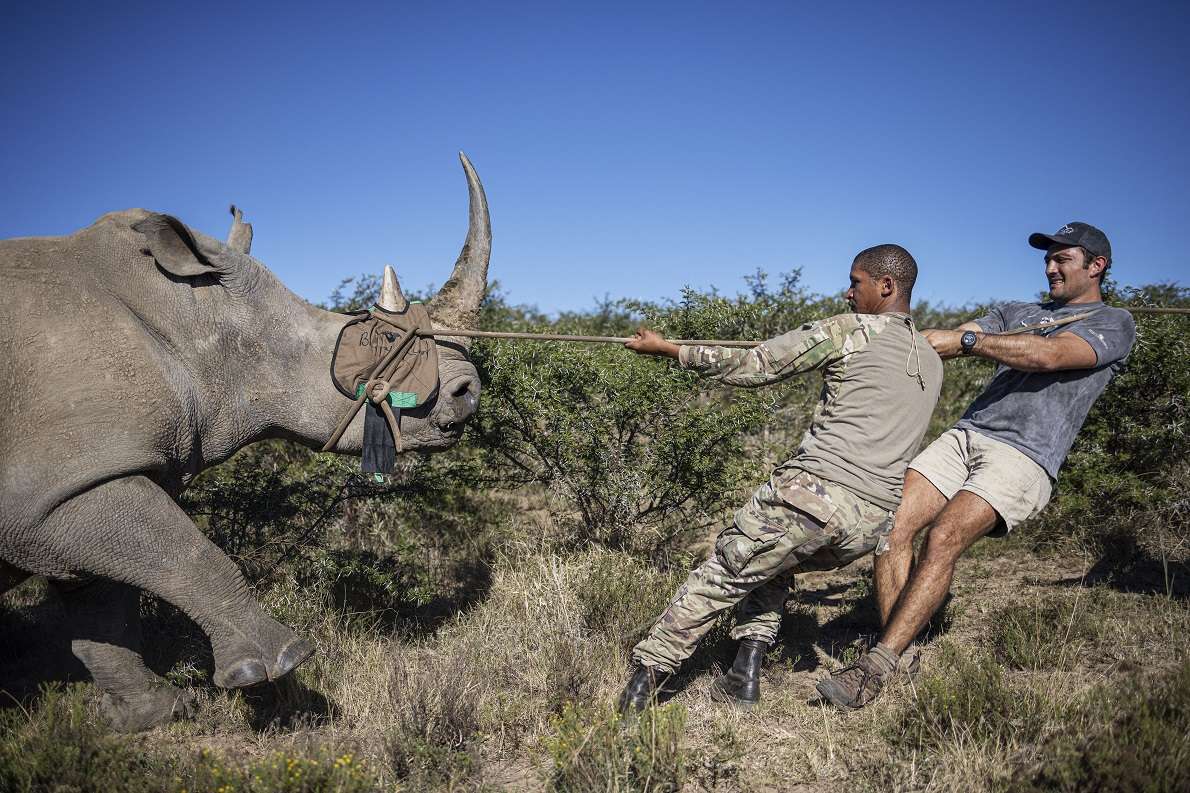 In Sudafrica un rinoceronte viene dislocato in un’area protetta dalla minaccia dei cacciatori di frodo. – Foto di Michele Spatari / Afp