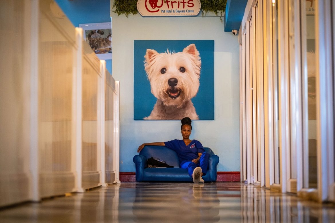 Una dipendente dell’atFrits Dog Hotel si riposa sotto il ritratto di un cane. Foto Tommy / Trenchard Panos Pictures