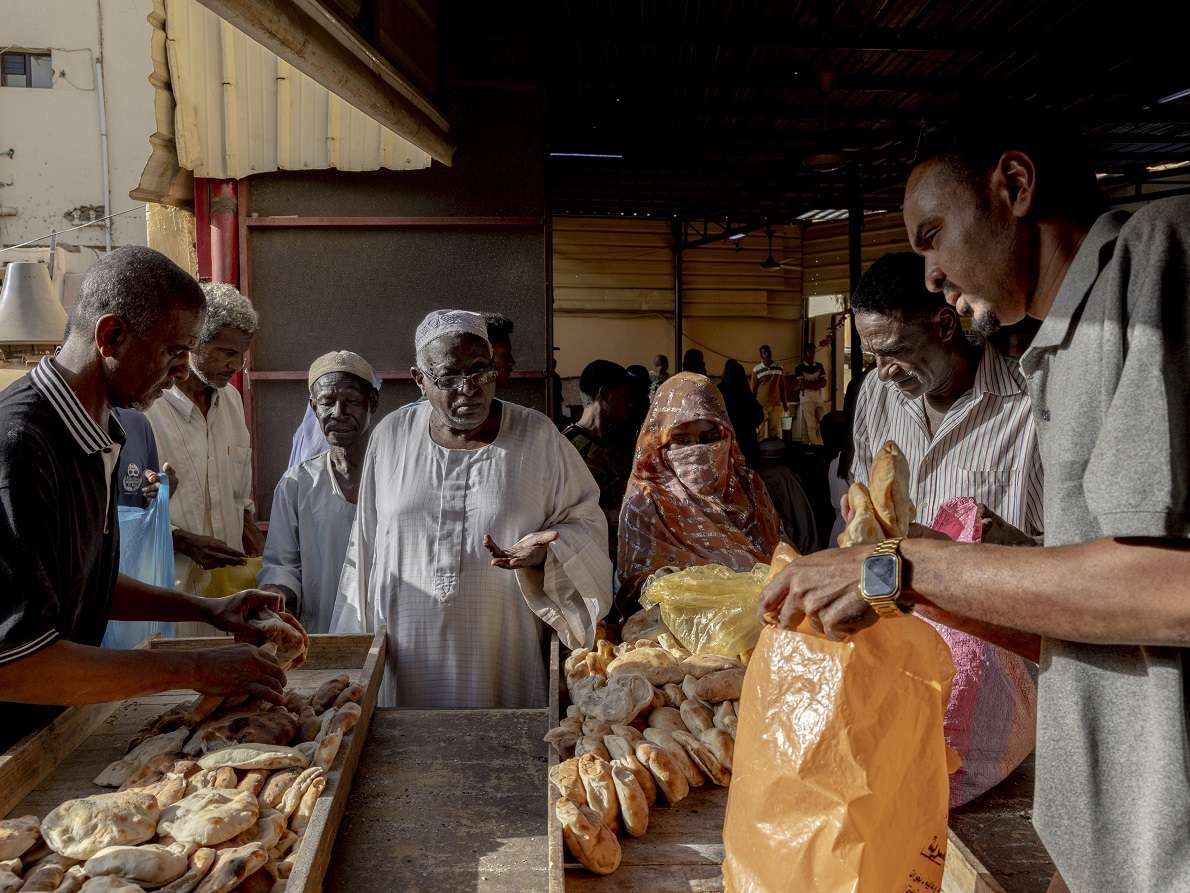 Civili di Khartoum ricevono pane fresco distribuito ogni giorno nel complesso dello sceicco Alamin, un dignitario sufi locale che ha offerto rifugio a centinaia di persone. – Foto di Ivor Prickett / Panos Pictures