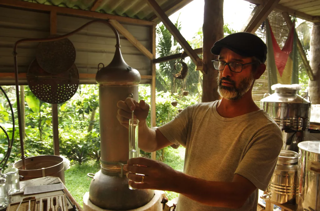 In questo lembo di terra tra oceano e foresta, la natura domina incontrastata, e l’attività agricola è stata concepita per integrarsi armoniosamente nel paesaggio, riducendo al minimo l’impatto dell’uomo. Le coltivazioni e le poche costruzioni – fra cui quattro accoglienti alloggi affittati ai visitatori su Airbnb – sembrano dissolversi nella selva lussureggiante, avvolte da un’atmosfera incantata che pare uscita dalle pagine di un romanzo d’avventura degno di un moderno Robinson Crusoe. Eppure il nostro Bastien non ha nulla dell’esploratore solitario scampato a un naufragio: sguardo attento, modi pacati, occhiali da intellettuale, assomiglia più a un ricercatore in missione sul campo che a un avventuriero sperduto. «Adoro questo luogo isolato nel verde», racconta. «Di notte, quando il buio avvolge la foresta, il cielo si accende di stelle». Bastien è un appassionato astrofilo: ama scrutare la volta celeste con il suo telescopio e riprodurre a mano libera astri e pianeti su cartoncini neri, che poi appende alle pareti del suo laboratorio. Ma la sua più grande passione è un’altra: la distillazione.