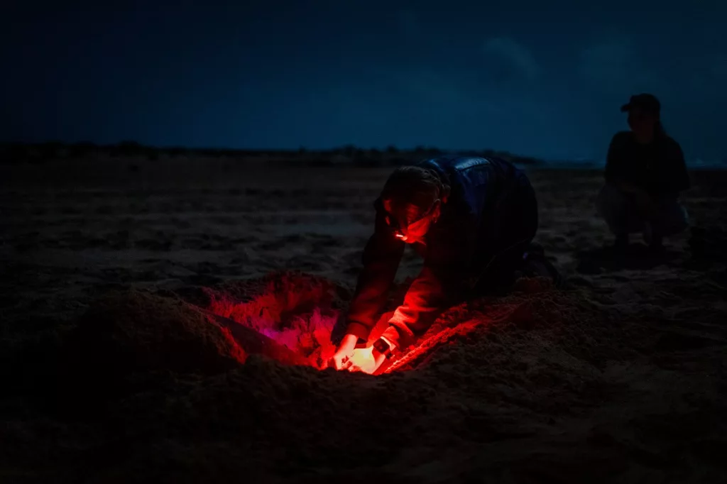 La prima difficoltà per chi veglia sulla costa è individuare le tartarughe nel buio della notte. «Non possiamo usare torce: la luce bianca spaventa le tartarughe, le disorienta e potrebbe farle tornare in mare in cerca di un altro posto più tranquillo», spiega Franziska Haas, biologa tedesca di 22 anni, originaria di Leichlingen. È al suo terzo anno da volontaria a Boa Vista, dove ha mappato centinaia di nidi sulla sabbia bianca di Lacacão, nel sud dell’isola. «Quando ne vediamo una, ci avviciniamo da dietro per non spaventarla, silenziosi come pesci. Anche il minimo rumore o le vibrazioni potrebbe allarmarla. Servendoci di una luce rossa fioca, la illuminiamo solo per un attimo, per capire se stia per deporre le uova o stia ancora scavando», racconta Franziska. Ogni squadra è composta da tre o quattro volontari con una formazione scientifica e almeno un ranger ambientale, professionista introdotto dal governo nel 2008 per coordinare le operazioni di sorveglianza. I ranger sono fondamentali nella salvaguardia delle tartarughe, essendo conoscitori esperti dell’isola e delle sue spiagge.