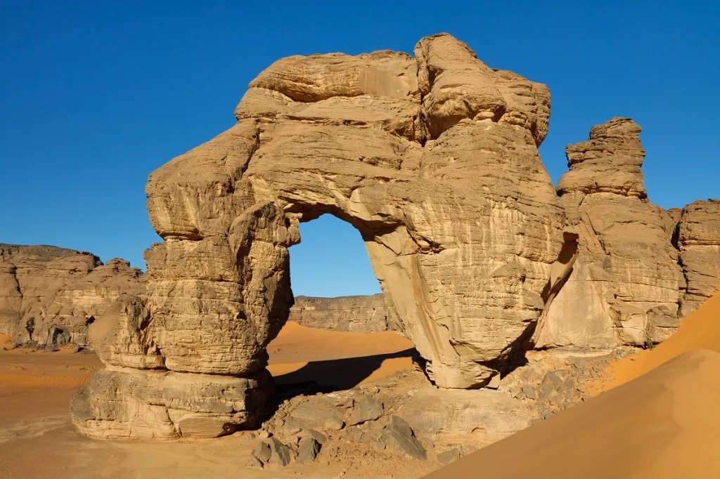 Infine, l’Acacus, un labirinto di pietra – largo 30 chilometri e lungo 150 – dove fiumi fossili si sono trasformati in piste intricate e in cui le montagne si sono sbriciolate in folletti di roccia, pinnacoli, archi, tunnel, grotte. Causa di tutto ciò, il vento, quel ghibli capriccioso e traditore che, soprattutto in gennaio e febbraio, soffia violento e distruttivo, avvolgendo implacabile uomini e animali e danneggiando i motori delle jeep. L’Acacus è una delle zone più magiche del Sahara, dove perdersi senza una meta, lasciando correre lo sguardo oltre la prossima duna, oltre la prossima curva. L’unico appuntamento da rispettare è il tramonto: da ammirare, in solitudine o in compagnia, seduti su un masso o sdraiati su una duna. Uno spettacolo indescrivibile di colori e di forme. Non è un caso che i Tuareg chiamino questo momento speciale «una finestra sull’anima»: quella degli uomini e quella degli dèi.