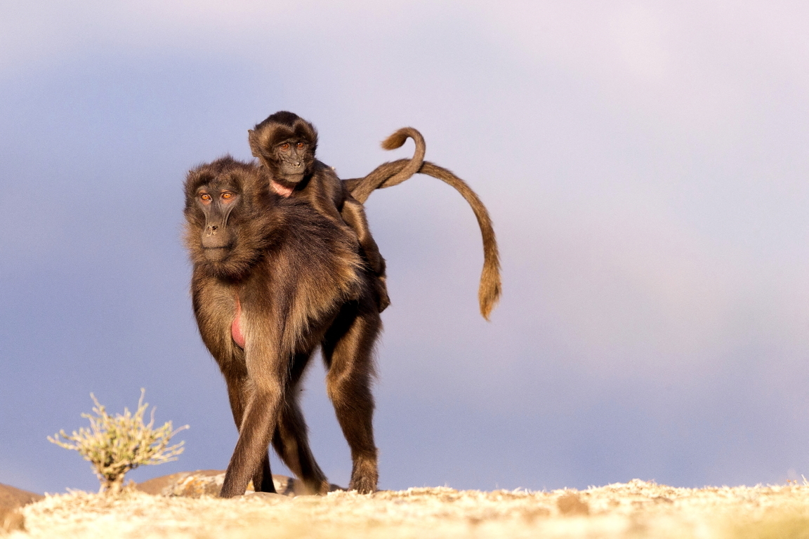 Una scimmia gelada con il suo piccolo. I Gelada emettono suoni articolati, muovono e fanno schioccare le labbra come gli esseri umani: sono gli unici primati a interagire in un modo così complesso.