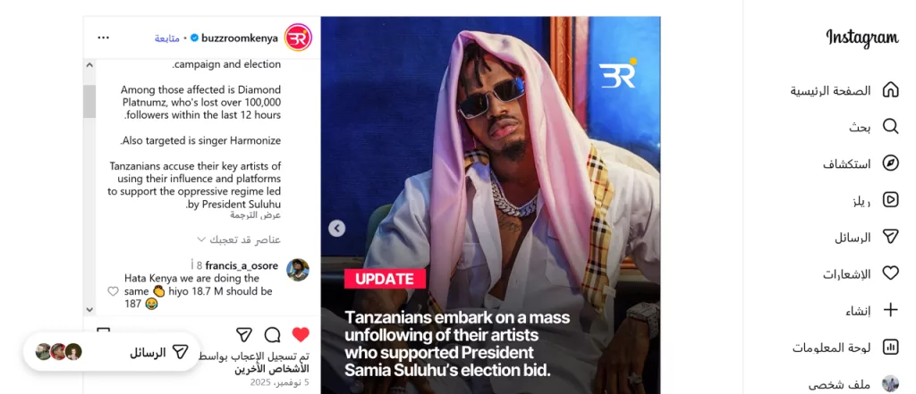 Diverse ricostruzioni online indicano che, nei giorni successivi al voto, Diamond Platnumz ha perso oltre 100.000 follower su Instagram, nel pieno della polemica per il suo endorsement a Samia Suluhu Hassan. Sotto la pressione dei commenti e delle minacce di boicottaggio, ha cancellato o archiviato tutti i post in cui sosteneva la presidente, salvo poi ripristinarli quando Samia è stata ufficialmente insediata.