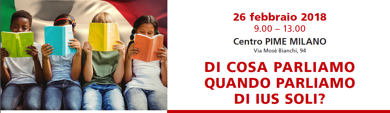 È in programma per lunedì 26 febbraio, dalle ore 9, un appuntamento da non perdere presso il Centro PIME Milano (Via Mosè Bianchi, 94) dove si affronterà il tema dello Ius soli e della cittadinanza durante il convegno ‘Di cosa parliamo quando parliamo di Ius soli? – Dalla Carta di Roma alla situazione italiana alle legislazioni dei principali Paesi occidentali’.