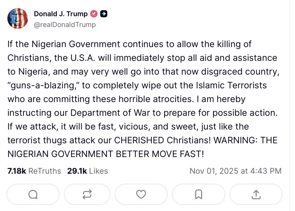 Donald Trump torna a parlare il linguaggio della forza. In un post pubblicato su Truth Social, il presidente degli Stati Uniti ha minacciato un intervento militare “a tutto spiano” in Nigeria se il governo di Abuja non fermerà “le uccisioni di cristiani”. Parole che evocano la retorica bellicista dei suoi primi anni alla Casa Bianca e che hanno immediatamente provocato una raffica di reazioni internazionali.