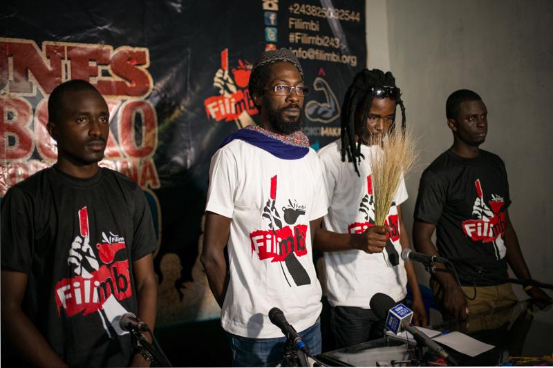 Fadel Barro (secondo da sinistra), leader del collettivo senegalese Y’en a marre, e Oscibi Johann (secondo da destra), del movimento civile del Burkina Faso Balai Citoyen, durante una conferenza stampa a Kinshasa (Rd Congo) – Foto di Federico Scoppa