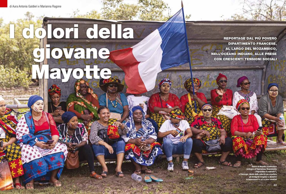 Donne di Mayotte manifestano sostegno all’Operazione Wuambushu (“Riprendere il controllo”), a Chirongui, ideata dalle autorità per espellere gli immigrati irregolari e demolire le baraccopoli in cui si sono insediati. – Copertina del servizio “I dolori della giovane Mayotte” pubblicata sul numero di maggio-giugno della rivista Africa. – Foto di Patrick Menihardt/ Afp
