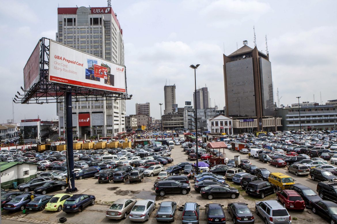 Una distesa di auto in un parcheggio di Lagos Island, in Nigeria. Foto di Andrew Esiebo/Panos.