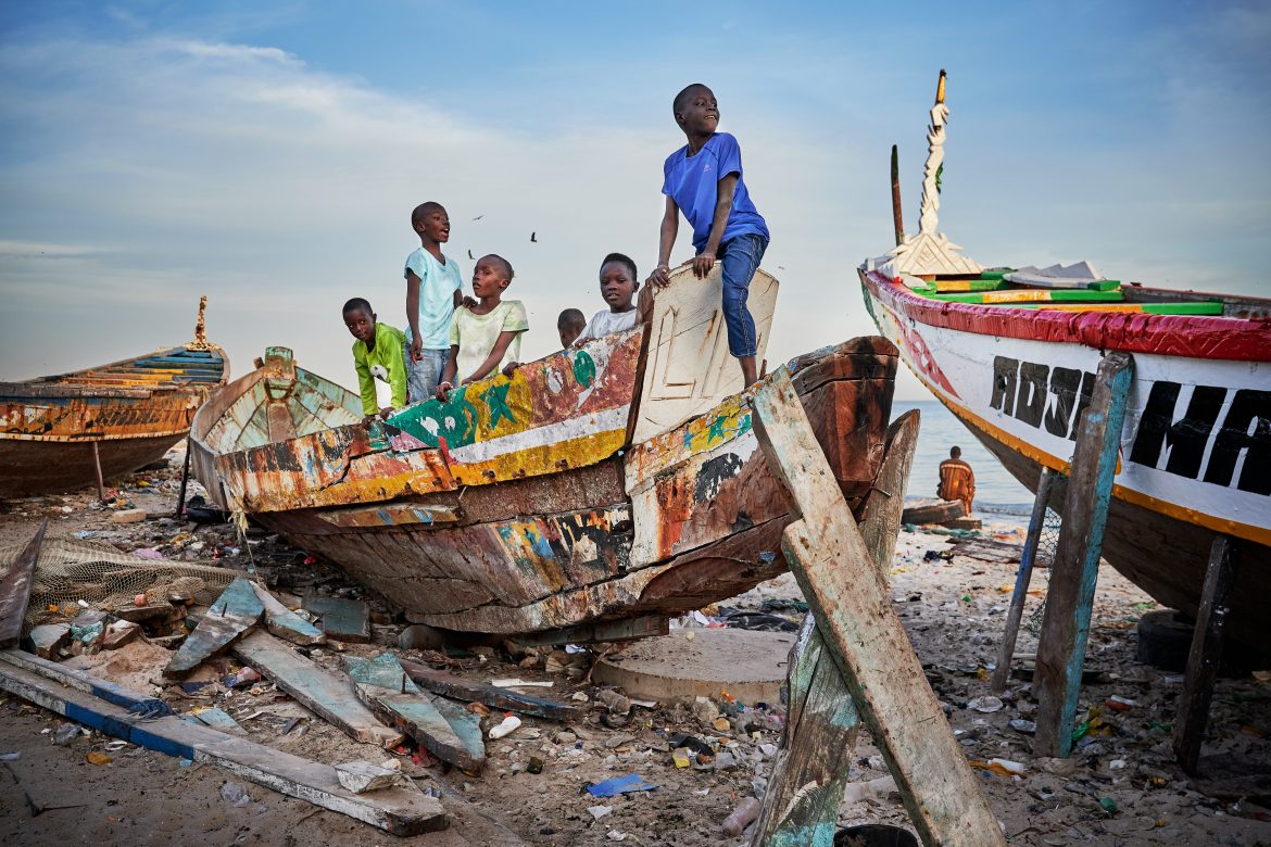 Bambini giocano su piroghe da pesca sulla spiaggia di Hann. In Senegal, queste imbarcazioni colorate sono spesso utilizzate per le pericolose traversate verso l’Europa. Foto di Christian Bobst