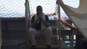 Questo inaspettato lungo lasso di tempo ha però permesso di entrare in contatto con i migranti, con la vita dell’equipaggio, nonché con tutti gli impedimenti che politicamente sono stati frapposti all’attracco. Abbiamo le testimonianze dei migranti che raccontano le esperienze che ormai già dovremmo sapere, sui trattamenti disumani e degradanti subiti in Libia ma che nella loro crudezza, ci colgono sempre impreparati. Le loro reazioni di disperazione di fronte all’eventualità di essere rigettati in quell’inferno dove la tortura e lo stupro sono esperienza quotidiana. Si può anche vedere la collaborazione di tutti, equipaggio e passeggeri, nel fare delle attività: ginnastica o corsi d’italiano improvvisati. Se da una parte l’intenzione dichiarata è quella di impiegare il tempo, è costante tra i medici la paura che qualcuno per disperazione si getti in mare. Anche perché fin dall’inizio le autorità dicono alla Capitana che deve riportare i naufraghi in Libia. Non avverrà, come sappiamo, ma è quello che viene ripetuto dalle autorità all’equipaggio per tutto il viaggio.