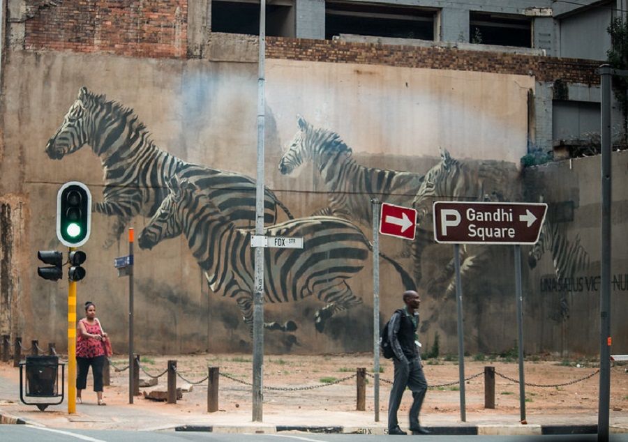 Gli animali della savana sono solo uno dei tanti soggetti che rendono “parlanti” i muri di Johannesburg. Da quelli più simpatici, raffiguranti per esempio una lucertola gigante che indossa scarpe da ginnastica rosse, a quelli che mettono in risalto questioni politiche.