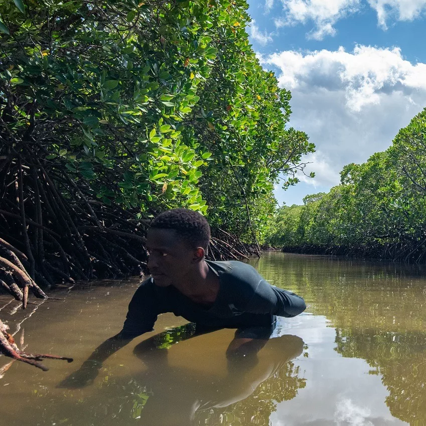 Uno studente del corso dedicato alla scoperta e alla tutela delle mangrovie, immerso in un canale dell’isola di Inhaca.