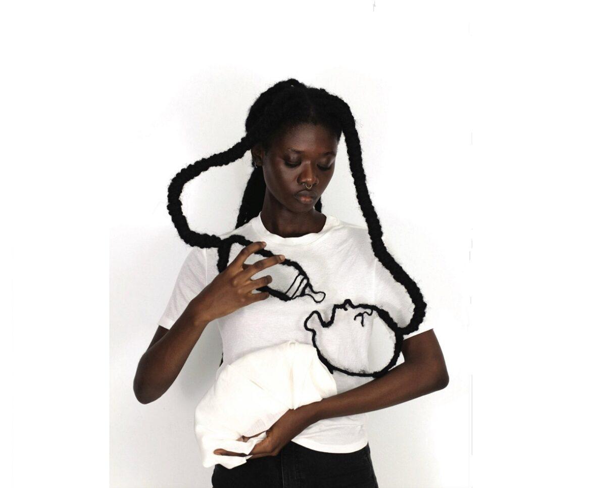 Una treccia trasformata in neonato, un’altra che prende le sembianze di un biberon. Le immagini che Laetitia Ky pubblica sui suoi social veicolano messaggi di denuncia sociale e rivendicazione dell’identità femminile. – Foto courtesy Laetitia Ky