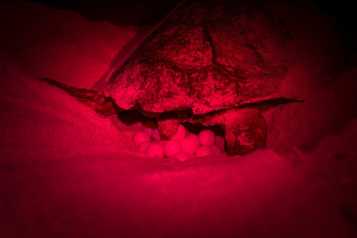 Una tartaruga depone le uova su una spiaggia di Boa Vista (Capo Verde). Da giugno a ottobre, ogni femmina può nidificare fino a tre volte, deponendo circa 100 uova per volta in una buca a forma di fiasco. L’incubazione, affidata al calore della sabbia, dura in media 50 giorni. – Foto di Luigi Avantaggiato