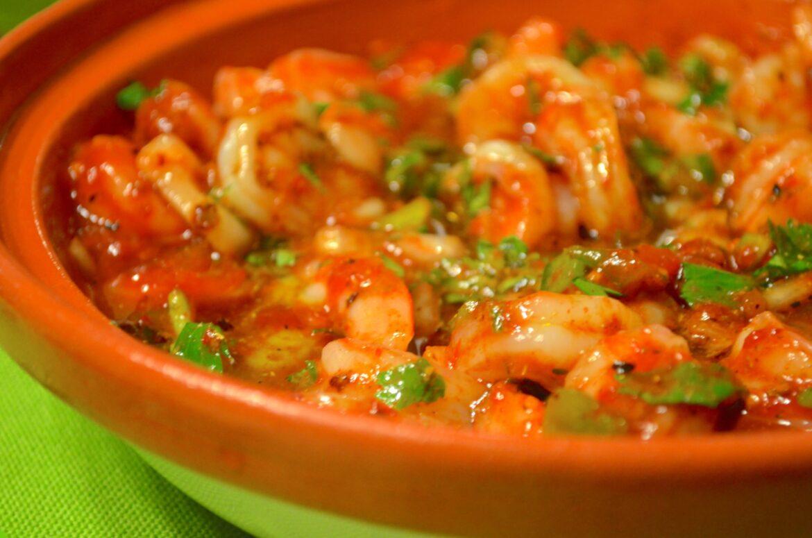 Lavate i gamberi sotto l’acqua corrente e scolateli. Puliteli rimuovendo la testa e i gusci. Lavate nuovamente i gamberi e metterli da parte a scolare. Nel frattempo pelate i pomodori e tritateli finemente con un coltello. Mettete una pentola (meglio se di terracotta) o la tradizionale tajine (o tagine) marocchina sul fuoco medio-basso. Aggiungete l’olio d’oliva e le cipolle dopo averle tritate finemente lasciatele rosolare per alcuni minuti. Unite l’aglio e abbassate la fiamma, rosolando ancora per circa un minuto. Aggiungete il trito di pomodori, le spezie, le erbe aromatiche e mescolare il tutto. Coprite la vostra tajine e fate bollire. Lasciate cuocere a fuoco lento i pomodori, mescolando di tanto in tanto, per circa 30 minuti, o fino a quando i pomodori possono essere schiacciati con il dorso di una forchetta fino a formare una salsa densa. A questo punto unite i gamberi, regolando la densità della salsa con un po’ di acqua se risulta poco diluito. Quando i gamberi vi sembrano abbastanza cotti, rimuovete la pentola dal fuoco. Al momento di servire guarnite con prezzemolo tritato, pepe e fettine di limone fresco.