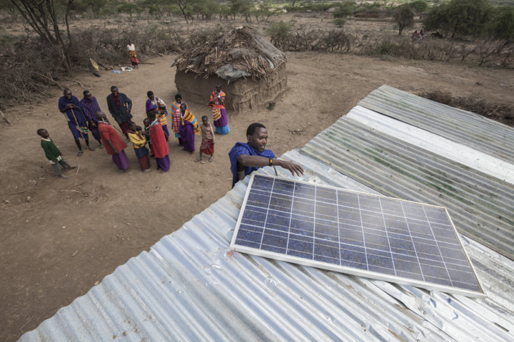 Un pannello solare viene posizionato tra le capanne masai nella regione di Simanjiro, Tanzania: servirà per far luce, ricaricare i cellulari e avere una radio. Sono poche le abitazioni che non hanno un apparecchio solare per i servizi elettrici di base.