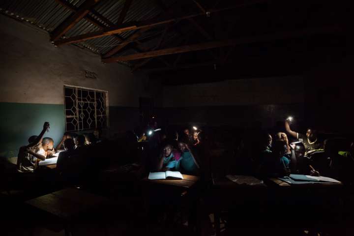 Un gruppo di studenti studia al lume di alcune torce. In Africa, quando il sole tramonta, trecento milioni di studenti rimangono al buio. Ma non rinunciano a studiare: a casa, in classe, nelle biblioteche e nei dormitori, ragazze e ragazzi, immersi nel buio della notte, per preparare le lezioni usano torce, cellulari e candele.
