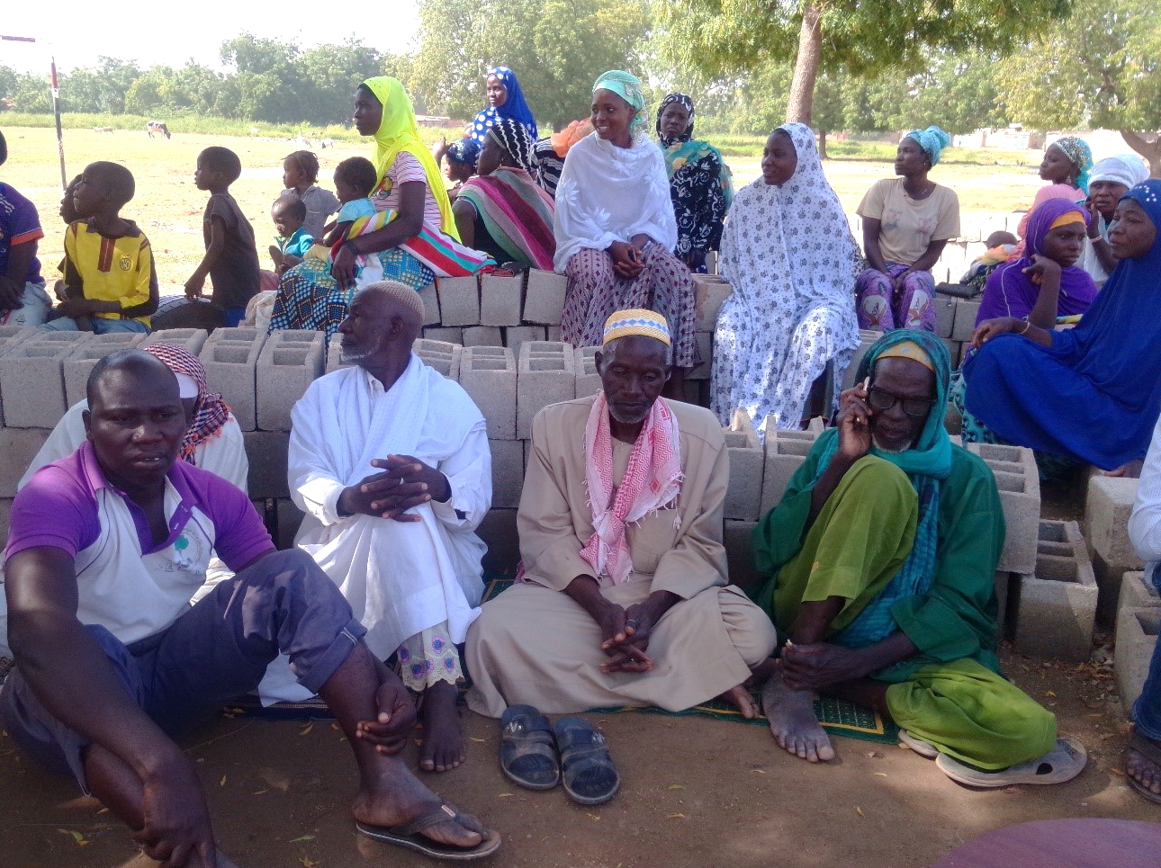 Quando arrivano, raccontano le loro storie ed accusano esplicitamente la popolazione Peul, allevatori e musulmani, di connivenza con i jihadisti. Si rinfocola così l’atavica diffidenza tra coltivatori e allevatori, tra stanziali e nomadi. Ancora paglia secca su un fuoco già acceso e che brucia senza soste! In ogni modo, i 600 di Bissighin sono arrivati a scaglioni. Qualche nucleo familiare da quasi un anno. Ora sono qui, all’ombra del neem. I più anziani seduti in prima fila, su stuoie intrecciate, con l’inevitabile cellulare che ogni tanto trilla; le donne in seconda fila, i bambini dappertutto.