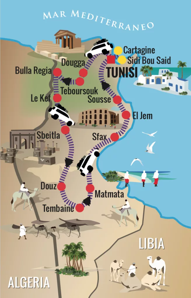 Visiteremo città numidiche e romane perfettamente conservate come Dougga, Bulla Regia e Sbeitla, scopriremo villaggi trogloditi, templi punici nascosti tra le montagne e antiche cave di marmo. Passeggeremo tra gli ulivi secolari e gli aranceti che punteggiano le fertili terre del nord, mentre le atmosfere dolci e rilassate dei centri costieri e le medine labirintiche ci inviteranno a perderci nei colori e nei profumi della vita quotidiana.