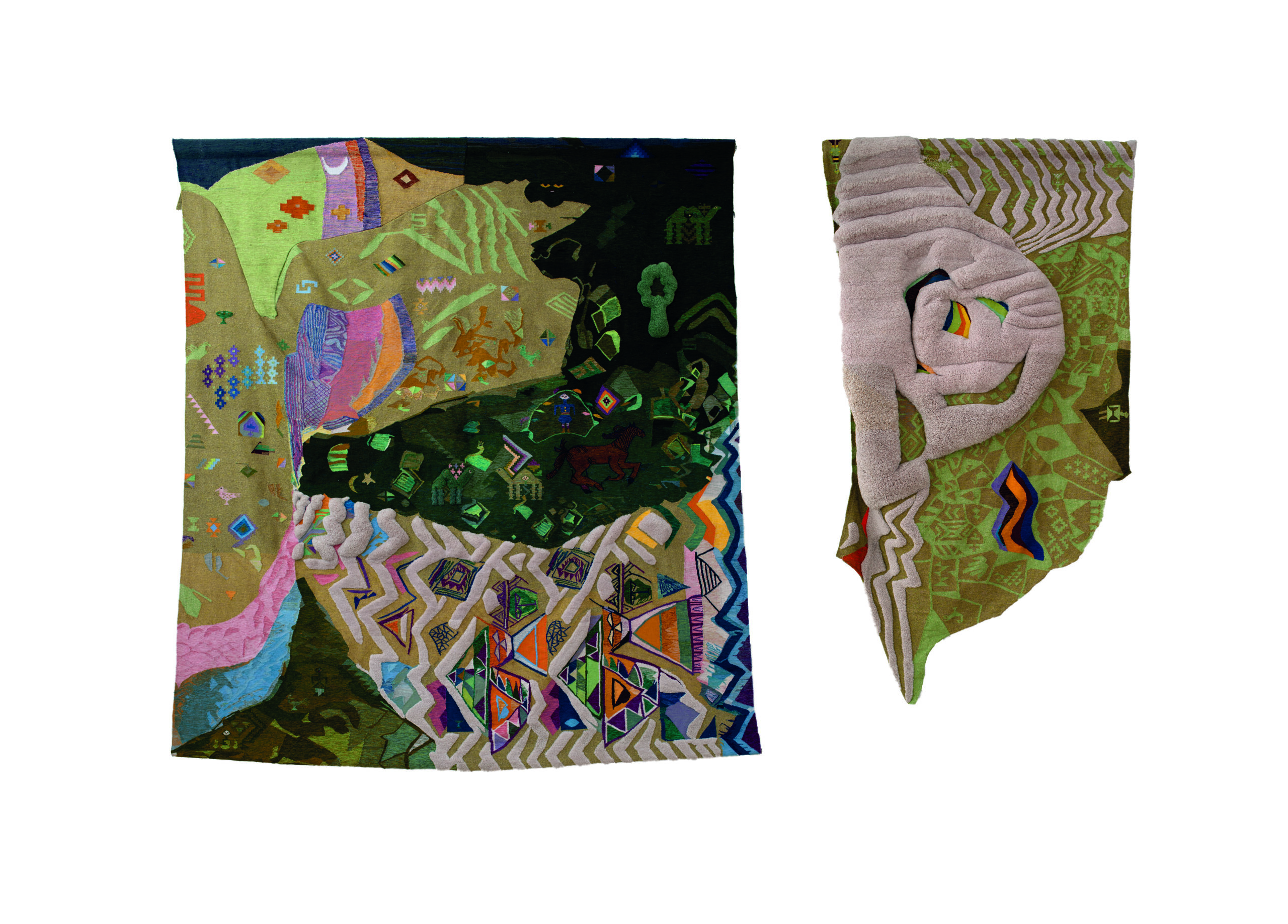 Con i suoi colori accesi, i motivi geometrici e figurativi, i segni zoomorfi e le figure antropomorfe, tessuti con lane tinte e filate a mano, il gioco di spessori e trame diversi, “Gafsa & ailleurs” (foto di apertura) si rifà alle tradizioni artigianali tunisine, introducendo al contempo elementi di modernità.