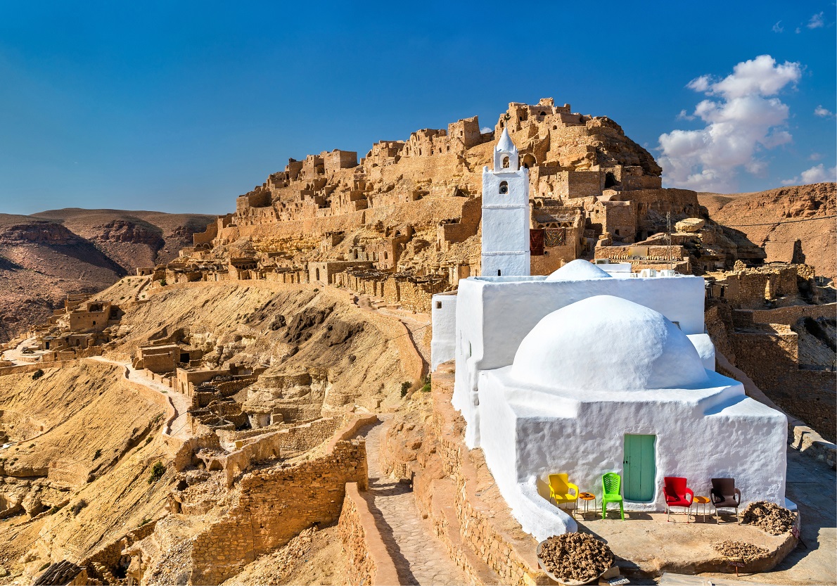 La moschea bianca svetta sull’antico villaggio berbero di Chenini, arroccato su una collina a 18 chilometri da Tataouine, nel sud della Tunisia, e incanta i visitatori con la sua architettura suggestiva e il paesaggio spettacolare che la circonda. – Foto di Shutterstock