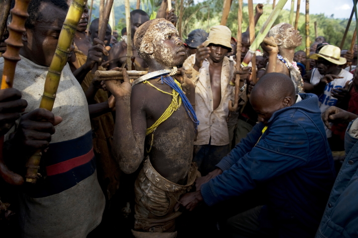 Giovani di etnia Bugisu si sottopongono al rito della circoncisione nell’est dell’Uganda: non devono mostrare alcun segno di paura o di sofferenza. Questo momento è cruciale per il passaggio all’età adulta.