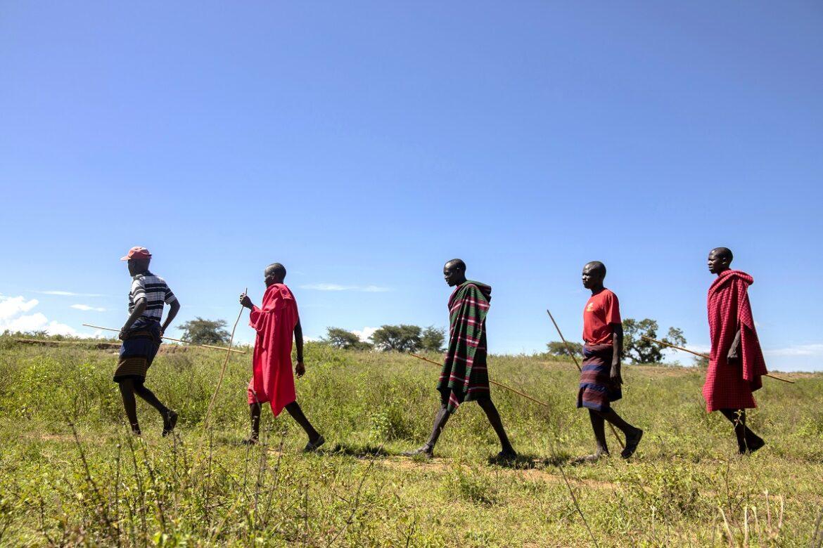 Uganda: pastori karimojong del villaggio di Ariamaoi perlustrano la zona per verificare le condizioni delle fonti d’acqua e dei pascoli. Si muovono in colonna per limitare i pericoli di razzie di bestiame e attacchi armati, sempre più frequenti nella regione. – Foto di Stuart Tibaweswa
