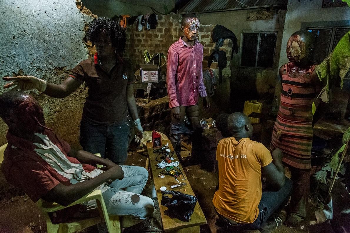 Truccatori al lavoro sul set di un film dell’orrore in Uganda. – Foto di Frederic Noy/ Panos
