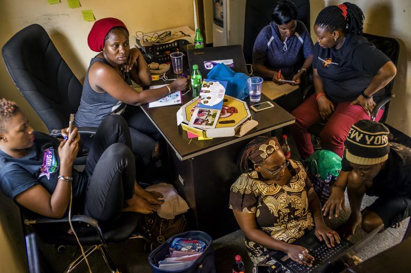 Stella Nyanzi assieme ad altre attiviste nell’ufficio di un’organizzazione che si batte per i diritti LGBT. Da anni è impegnata in campagne che l’hanno resa popolare tra le donne. – Foto di Frederic Noy / Panos / Luz