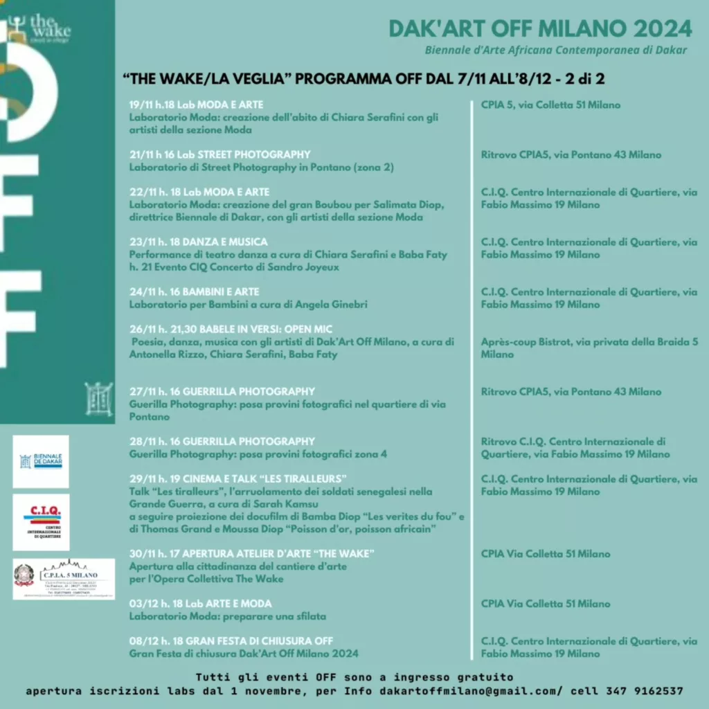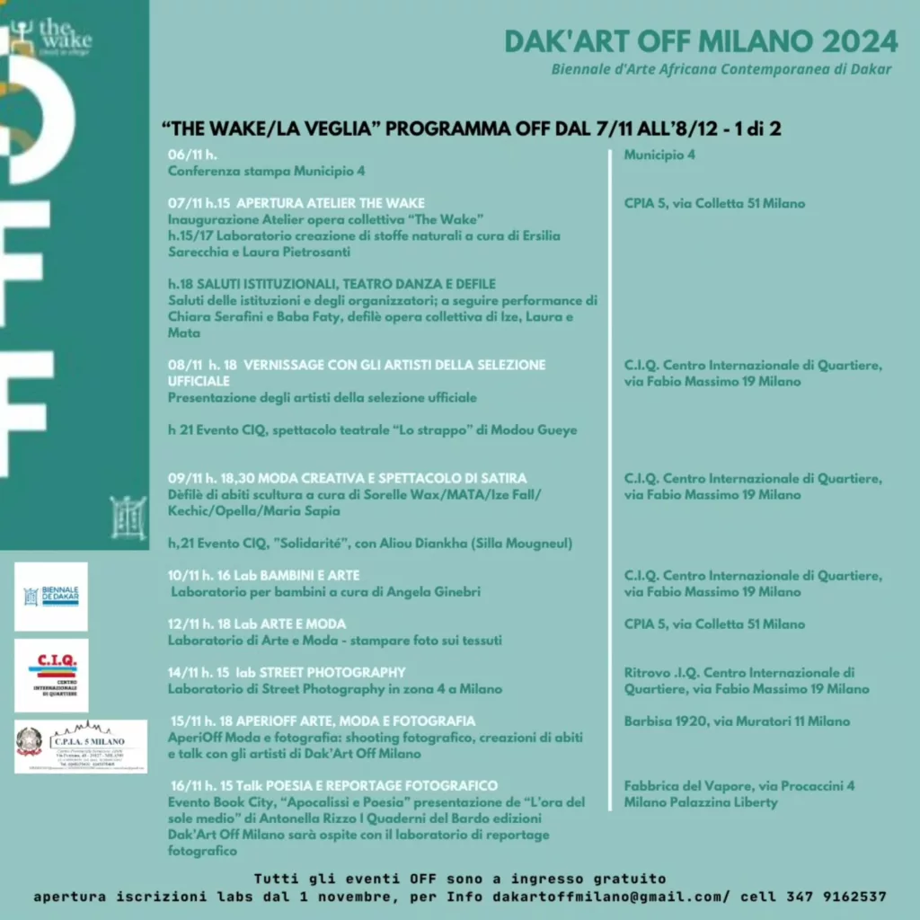 La Biennale d’Arte di Dakar arriva a Milano in Zona 4 dal 7 novembre al 7 dicembre con DAK’ ART OFF MILANO, un evento artistico che coinvolge la città in un progetto creativo a cielo aperto. Con sei sezioni che spaziano dalla pittura alla moda, artisti locali e internazionali collaboreranno per creare “The WAKE,” un’opera collettiva che riflette sul tema della veglia e del cambiamento. Scopri l’intero programma nei canali ufficiali Facebook e Instagram della manifestazione.