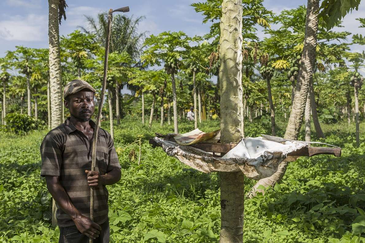 Un lavoratore in una piantagione che produce papaina. La papaina è presente nei frutti di papaia ed è un il lattice richiesto