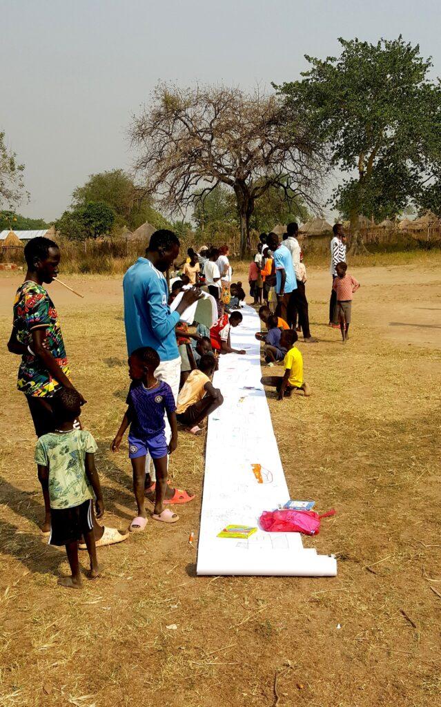 Passano alcuni giorni e un centinaio di chilometri prima di srotolare nuovamente il lungo rotolo di carta. Una grande distesa di terra e polvere ed una trentina di ragazzi che giocano a calcio sotto gli occhi di altrettanti bambini e bambine. Bastano pochi attimi per abbattere l’iniziale e giustificata diffidenza per vedere sempre più persone accovacciate sul rotolo con un pennarello colorato in mano. Altre bandiere, questa volta sia sud sudanesi che ugandesi, ed altrettante macchine, case, alberi.