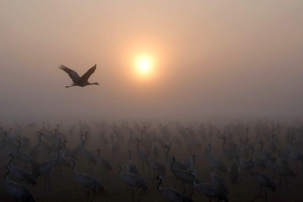 Una colonia di gru fotografata nelle vicinanze del Lago Agamon, nella Valle di Hula (nord di Israele), durante la loro rotta migratoria stagionale dall’Europa all’Africa. – foto di Jalaa Marey / Afp